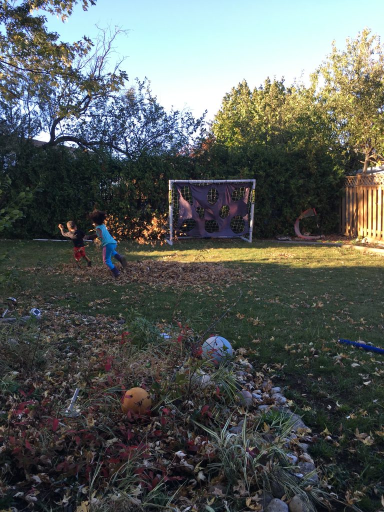 We first read the book and learned all about bugs. The last page of the book asks what bugs you can find in your backyard so off we went. We started with a nature hunt which got them looking for the bugs in their book as well as the beautiful Fall leaves (even though the weather has been gorgeous). Once they were done looking for different colour leaves, we raked them all up and had fun jumping in them. The best learning is done through play.