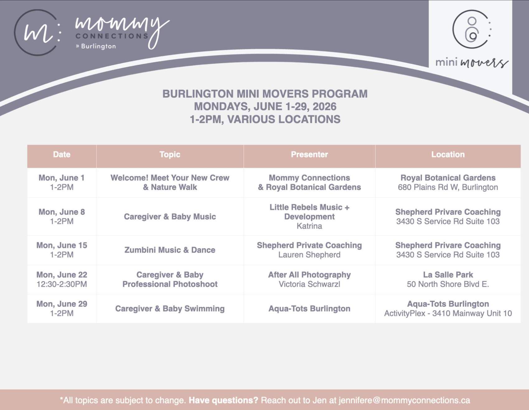 The days of chatting with other parents while your baby naps may be over – but it doesn’t mean the fun has to stop! Join our Mini Movers program taking place at various locations across Burlington.