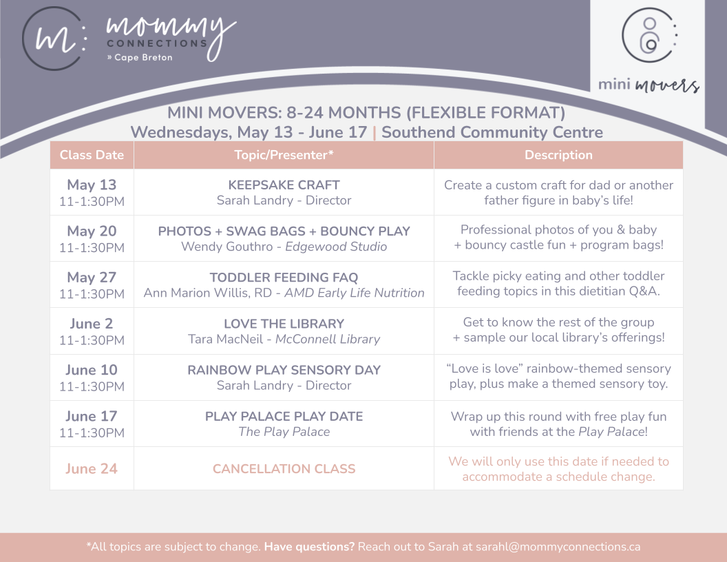 We’ll meet every *Wednesday in our Mommy Connections community space in the Southend Community Centre. This is a 6-week program designed for babies from ~8 months (crawling) to ~24 months (early walking). These mobility milestones are just a guide—alternative mobility/skills always welcome within the age range!