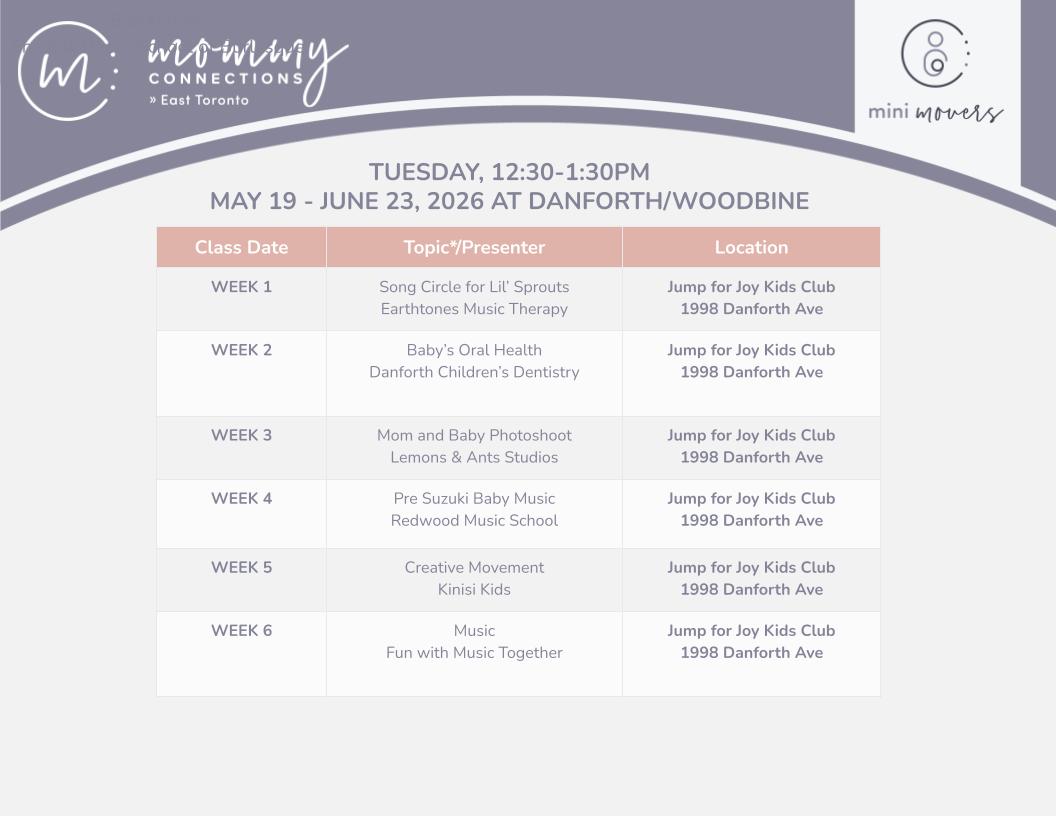 Is your little one on the move? We have a program for that! The days of chatting while your baby naps may be over – but it doesn’t mean the fun has to stop! Join us for our 6 week Mini Movers Session @ Danforth & Woodbine!
