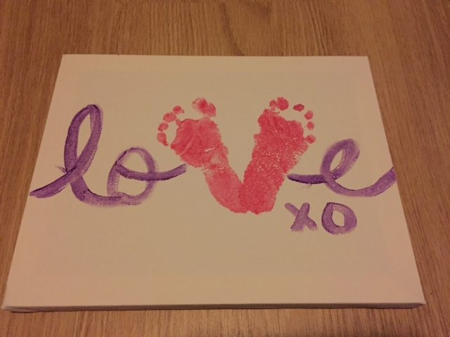 Look at this super cute art piece we made in our Mom and Baby group! It was for Valentine’s Day, but what a great idea for any special occasion, like Mother’s Day, Father’s Day or a birthday!