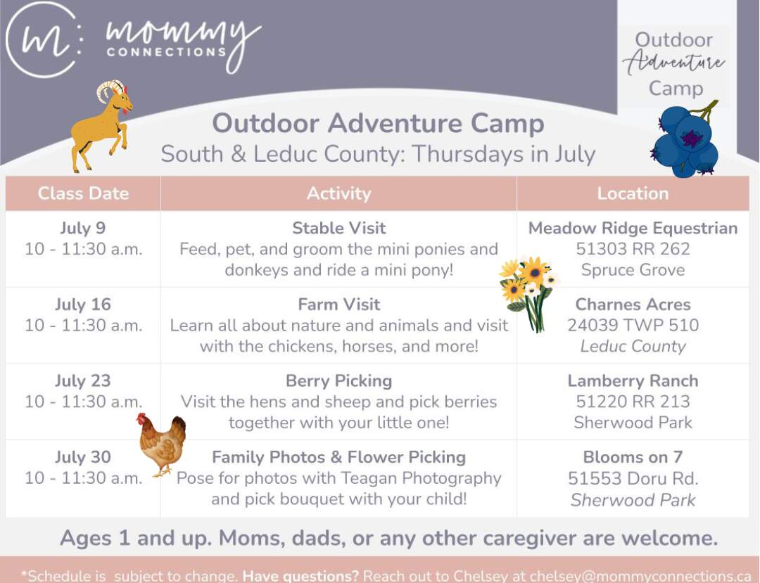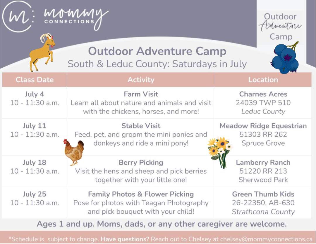 Our Outdoor Adventure Adventure Camps are back this summer for families in Leduc, Beaumont, and Edmonton ! They’re the perfect summer adventure for the whole family. Every week will be a new adventure! You’ll explore new places and connect with other families, all while learning and spending time outdoors with your children. This camp is great for the whole family and all ages are welcome, including school-aged children. Each camp includes four outdoor adventures. Moms, dads, grandparents, and any other caregiver are welcome to register.