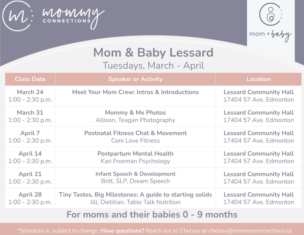 Learn, have fun with your baby, and meet other new moms in West Edmonton in our Mom & Baby Program in Lessard this spring.