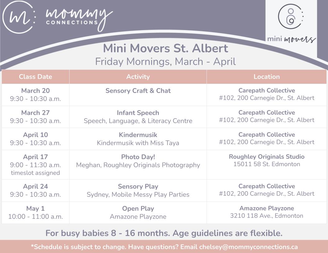 Have a busy, on-the move baby? Learn, socialize and have fun with your active ‘older’ babe! Join us for six weeks of fun and discovery in our Mini Movers Program for families in St. Albert this spring!