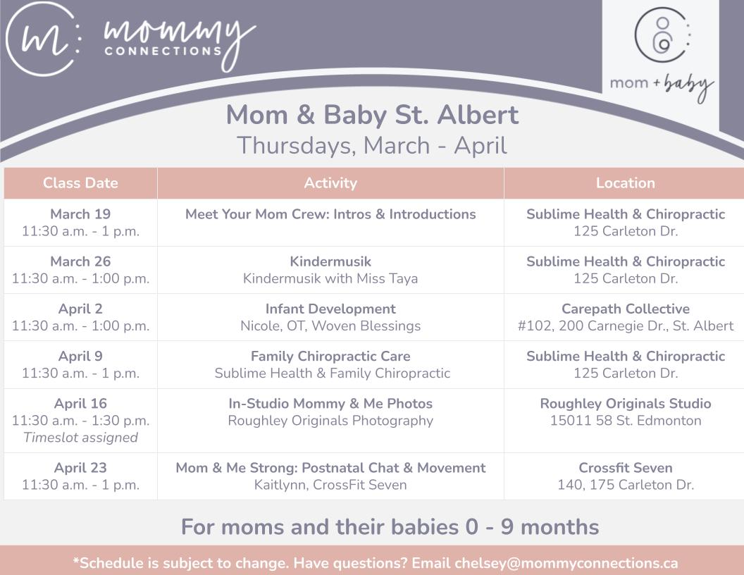 Learn, have fun with your baby, and meet other new moms in St. Albert in our Mom & Baby Program in St. Albert this spring.