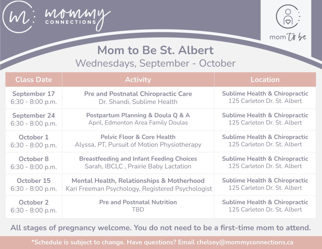 You’re invited to our Mom to Be Program for expecting moms in North Edmonton and St. Albert. We will meet in-person each week and will be joined by the best local experts on all things pregnancy and postpartum! You’ll hear from a local lactation consultant on all about breastfeeding and infant feeding. You’ll learn all about postpartum mental health, creating your own postpartum plan for a safe and healthy postpartum period. We’ll also delve into pelvic floor and core health. This class may also include a prenatal yoga or fitness class. Most importantly, you’ll meet a village of supportive women who are at the same stage as you.