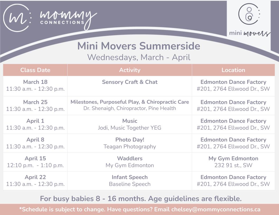 Have a busy, on-the move baby? Learn, socialize and have fun with your active ‘older’ babe! Join us for six weeks of fun and discovery in our Mini Movers Summerside Program for families in South Edmonton and Leduc & Beaumont this spring!