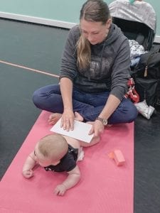 Start by making sure you are doing the craft in a safe spot, on the floor is the safest and easiest spot, but make sure you are prepared for the possibility of pee happening (even though we take safety measures – babies can be sneaky and still get some out) and if you have a roller or mover, make sure you are on a surface that is easy to clean. We did our crafting on my class yoga mats that are easy to clean, and I am not worried about them getting paint on them.