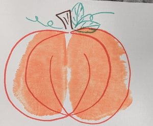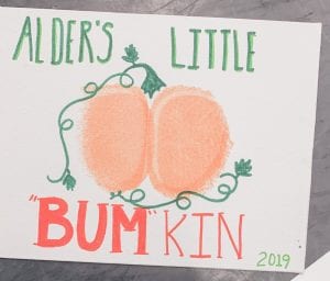 Once baby is happy and you got all the snuggles you like for the moment, check to make sure paint is dry and once it is use the sharpies to draw the stem, leaves, vines, and lines (if you wish to add shape lines or outline the Bum-kin). I also suggest writing something on it as well, for example our moms wrote things such as: Baby’s First Halloween, Baby’s Bum-kin, Our Little Bum-kin, Cutest Bum-kin in the Patch. And I always encourage writing the date, even if it is only on the back!