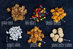 So, I usually separate the ingredients, putting them in bowls and then giving my children the choice to pick which snacks they like. My only rule is that they must choose two healthy snacks before choosing a tasty snack. Once they pick their snacks, they scoop them into their own bowls and munch away! Simple as that!