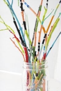 They decorated the twigs in stripes, polka dots, however, they wanted. In fact, they spent an entire afternoon painting these sticks for the house. Once they were finished we let the sticks dry. The next day they all came to me and wanted me to put their twigs somewhere in the house. I grabbed a decent size bouquet for them to put all their twigs in and then my eldest grabbed the vase and set it in the middle of our coffee table.