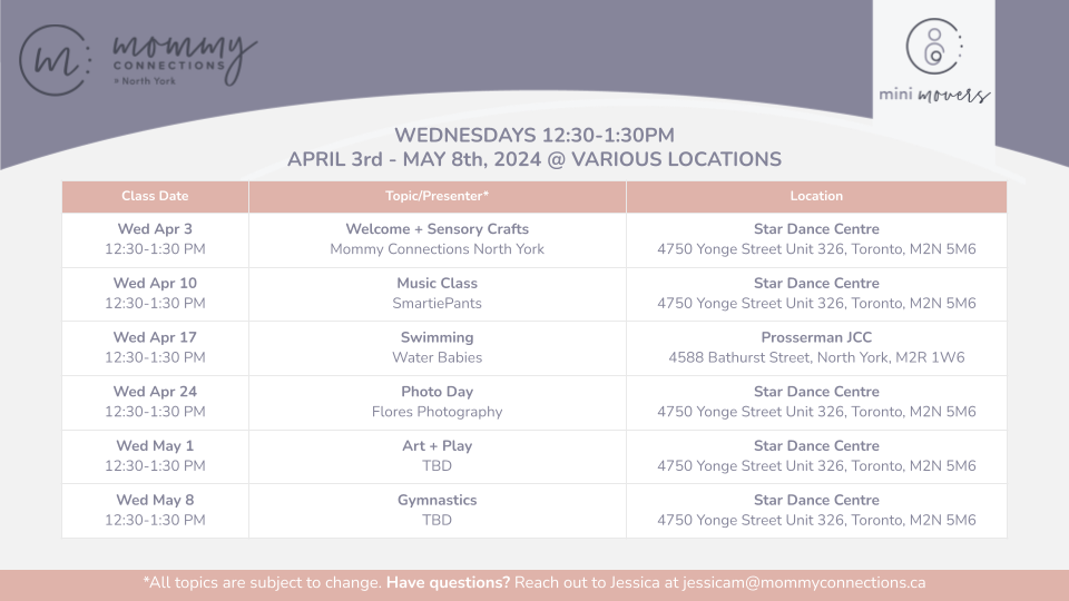 Each week we will meet at different locations for a new activity giving you and your babe the opportunity to experience a wide variety of what each local business has to offer.