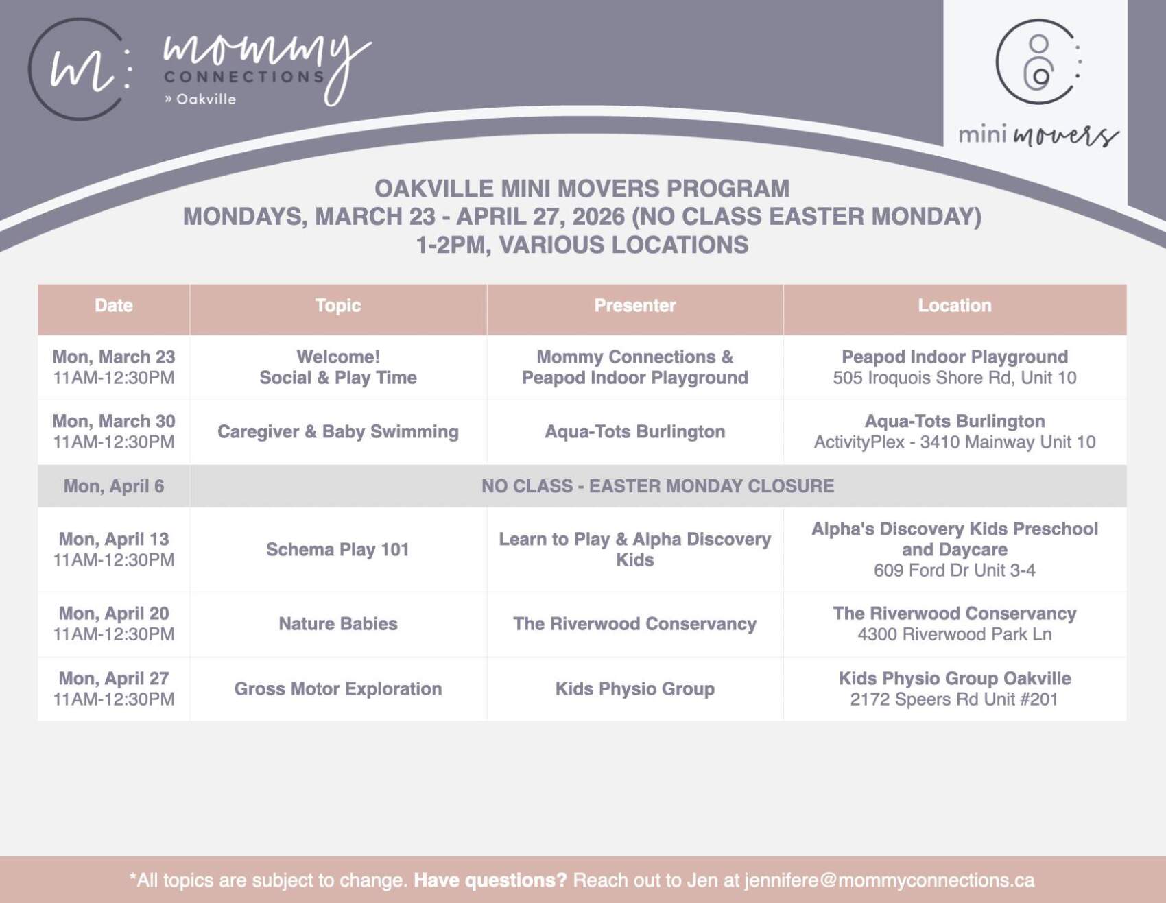 This five week program runs Mondays, March 23 to April 27, 2026. No class on April 6 for Easter Monday long weekend. Classes will take place at various family-friendly venues across Oakville and nearby surrounding areas.
