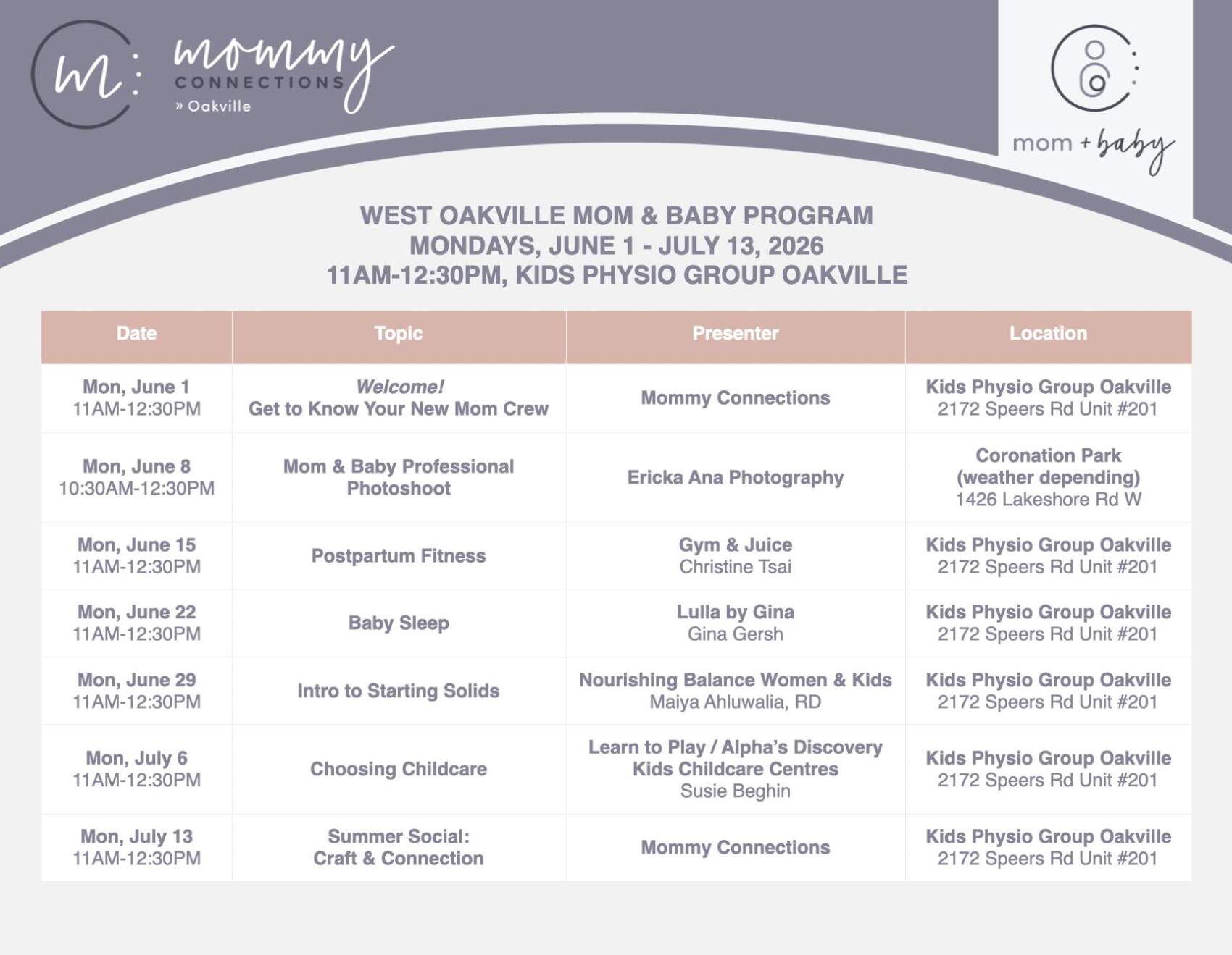 This seven-week program runs every Monday morning, 11am-12:30pm from June 1 to July 13, 2026. We will meet indoors at Kids Physio Group Oakville, which is located at 2172 Speers Rd. near Speers/Third Line.