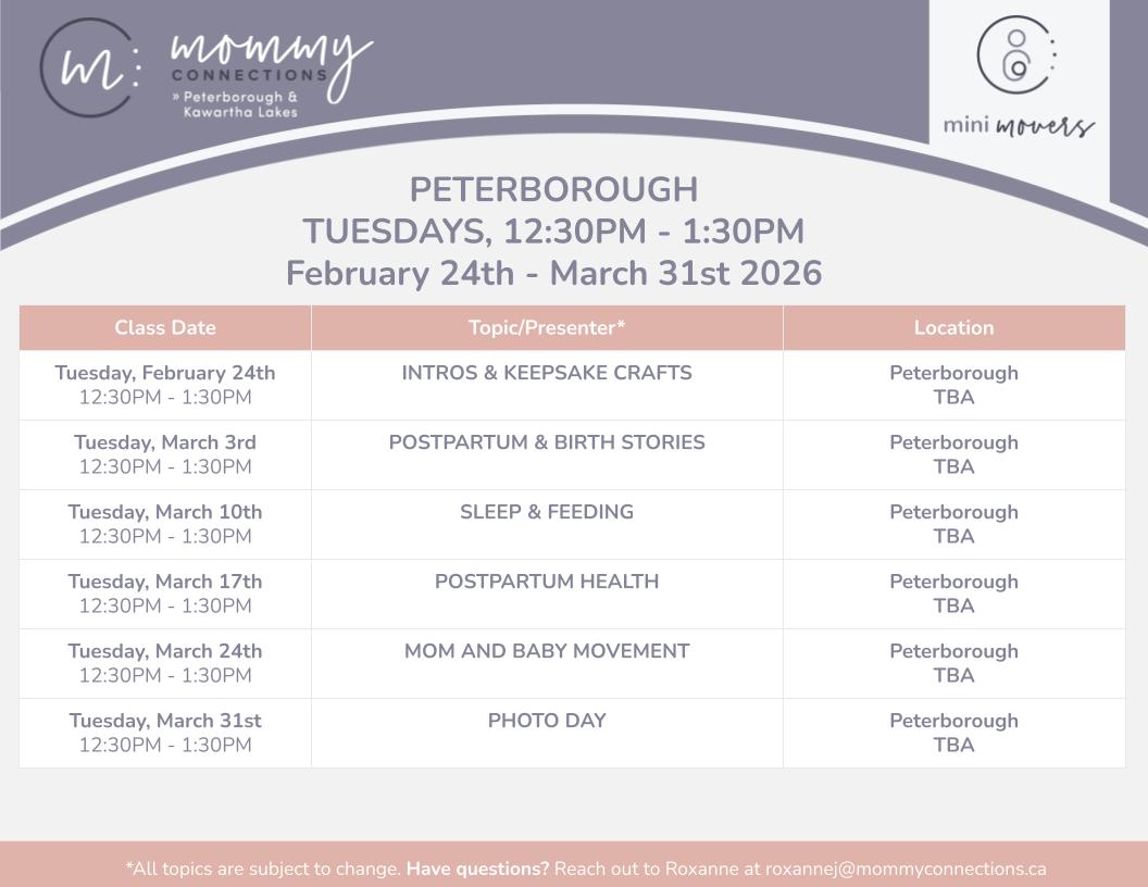 This session runs for 6 weeks beginning on Tuesdays, February 24th – March 31st 2026 and runs from 12:30PM-1:30PM in Peterborough as well as various locations within Peterborough and surrounding areas.