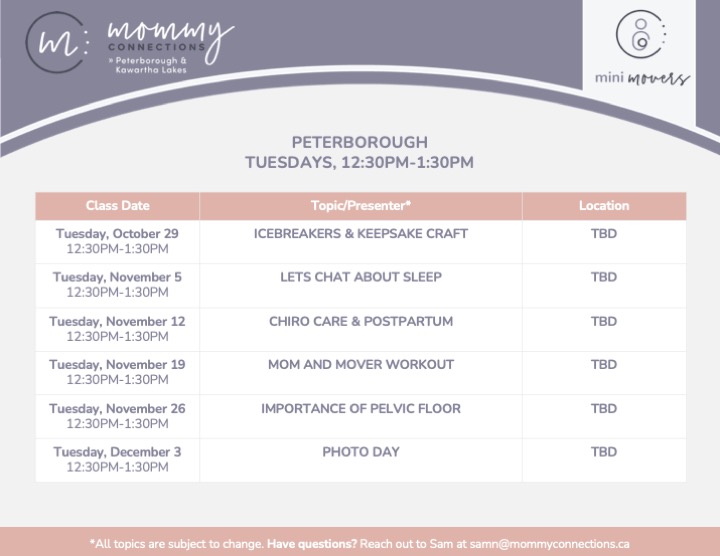 Sign up here to be added to the waitlist for our upcoming Peterborough Mini Movers Class for caregivers with babies 8-18 months.