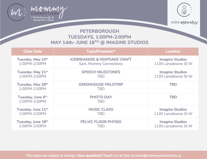 A: The class is facilitated by the Director of the Peterborough and Kawartha Lakes Mommy Connections chapter, Sam. She is a mom of 2 under 2 and is living in the chaos of what 2 littles brings. She can’t wait to meet you and your littles and start some real, no judgement mom chats! Local experts also lead discussions and presentations during the 6 week course!
