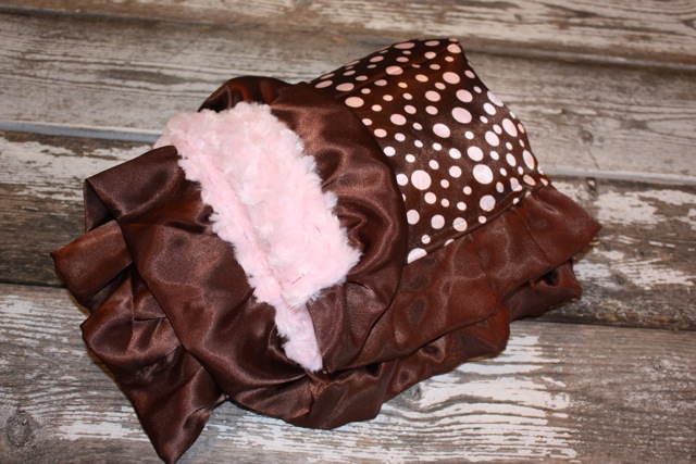 *What is the name of the baby blanket that is brown and pink paisley satin on pink minky swirl, finished with a pink ruffle trim?*