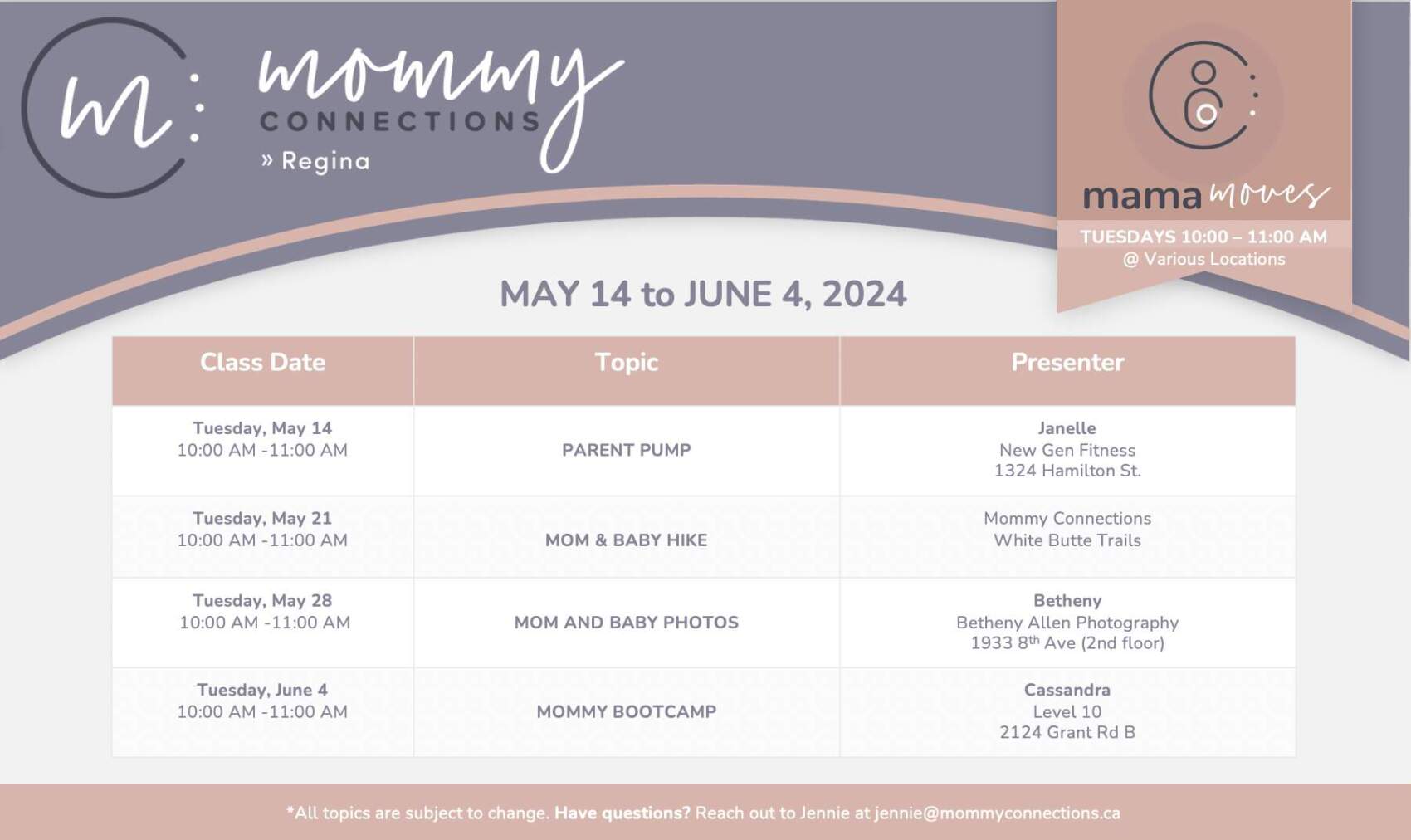 We meet from 10:00 am to 11:00 am on Tuesdays at various locations around Regina. Each fitness class is 45 minutes followed by 15 minutes to informally socialize with the group. Our next 4-week session begins on Tuesday May 19. We will be joined by Betheny Allen Photography 1 of the 4 weeks for Mom and Baby Photos.