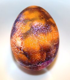 With this egg we loosely covered the entire egg in masking tape, so a bit of dye got in a few places, creating a tie-dye look