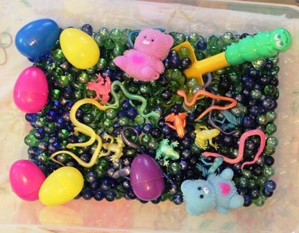 We then added some different toys, along with a shovel. The items we included had a variety of different textures and feels.