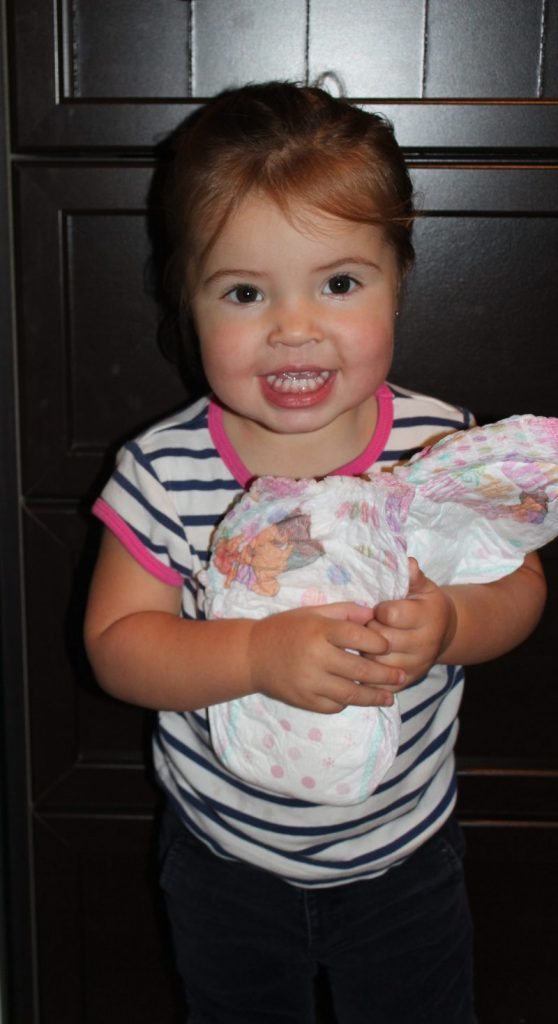 We are in the early stages of potty training our daughter so we were so excited to receive these brand new Pampers Easy Ups! My daughter was thrilled when the package arrived in the mail and she was able to open it!