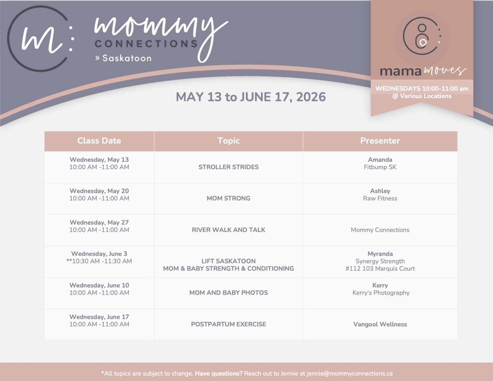 This class is BYOB (bring your own babe!) and offers a fun and low-pressure way to get out of the house, socialize, and see what Saskatoon has to offer in the way of postpartum fitness options.
