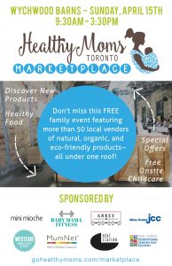 The next Healthy Moms Toronto Marketplace is at Wychwood Barns on Sunday, April 15, 2018. This is a FREE event! Shop from a curated selection of natural/organic/sustainable items for the whole family. Enjoy healthy food options, a breast/bottle feeding lounge and complimentary onsite childcare, in case you need a little solo shopping time. Healthy Moms Discount Cardholders will have access to awesome deals but don’t worry – If you don’t have a card yet, you’ll be able to get it at the marketplace. Visit their website for a list of participating vendors. BRING YOUR FRIENDS…This is an event you won’t want to miss!!